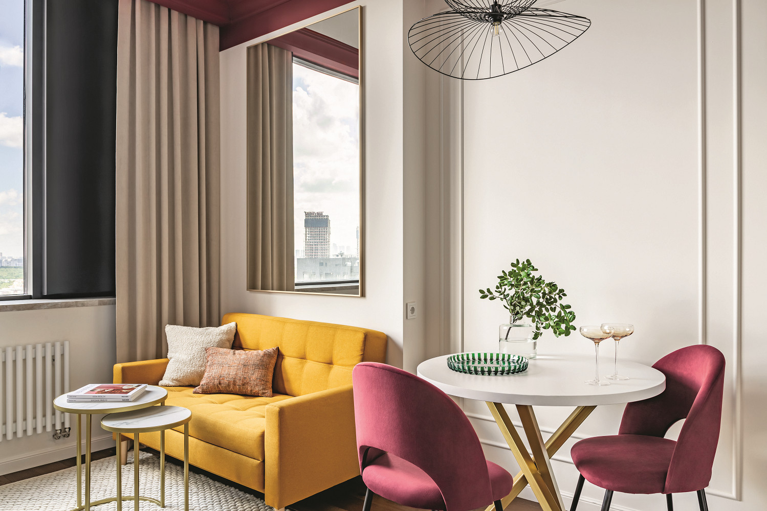 Квартира в современном московском ЖК выходит окнами на Москву-реку, Москва-Сити и Поклонную гору. Место оживлённое и удачное для сдачи квартиры в аренду. Для создания дизайн-проекта именно под эту задачу и его воплощения в жизнь заказчик пригласил архитектора Карину Алтунину. Вместе со своей командой она сделала интерьер, придя в который человек будет чувствовать себя как дома, пользоваться качественным ремонтом и предметами обстановки, переключаясь с бешеных ритмов города на расслабляющие оттенки бургунди.