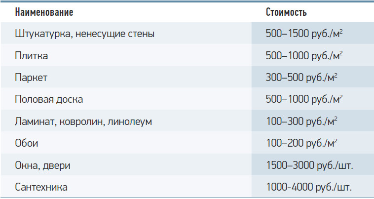 Примерная стоимость некоторых услуг по демонтажу