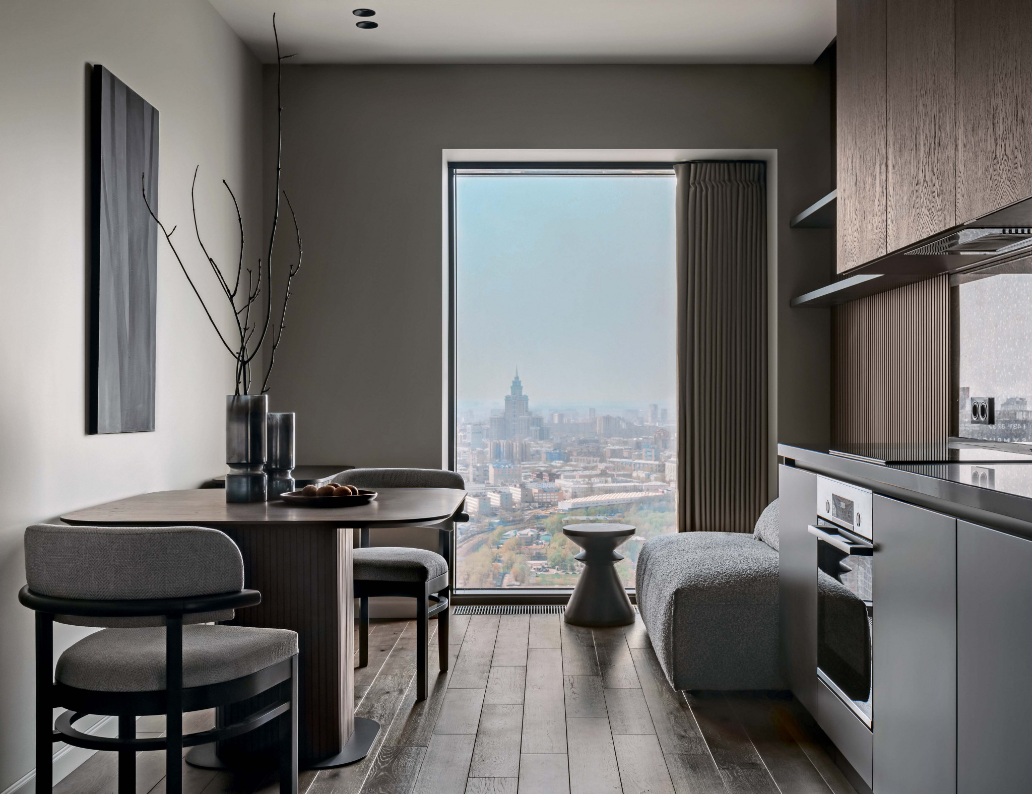Интерьер, оформленный в современной эстетике, отвечает чаяниям молодой заказчицы, не спорит с архитектурой жилого комплекса и не отвлекает от головокружительных панорамных видов, открывающихся с высоты пятидесятого этажа. Создать необычную и смелую атмосферу помогают элементы стиля мемфис, что заметно по цветовому решению и разноплановым геометрическим формам предметов мебели: столиков, стульев, кушетки, комода. Базой оформления стала сдержанная природная колористика. Функция доминанты отдана открытому ярко-синему цвету на потолке и стене спальни. Дополнительными акцентами стали оранжевые детали.