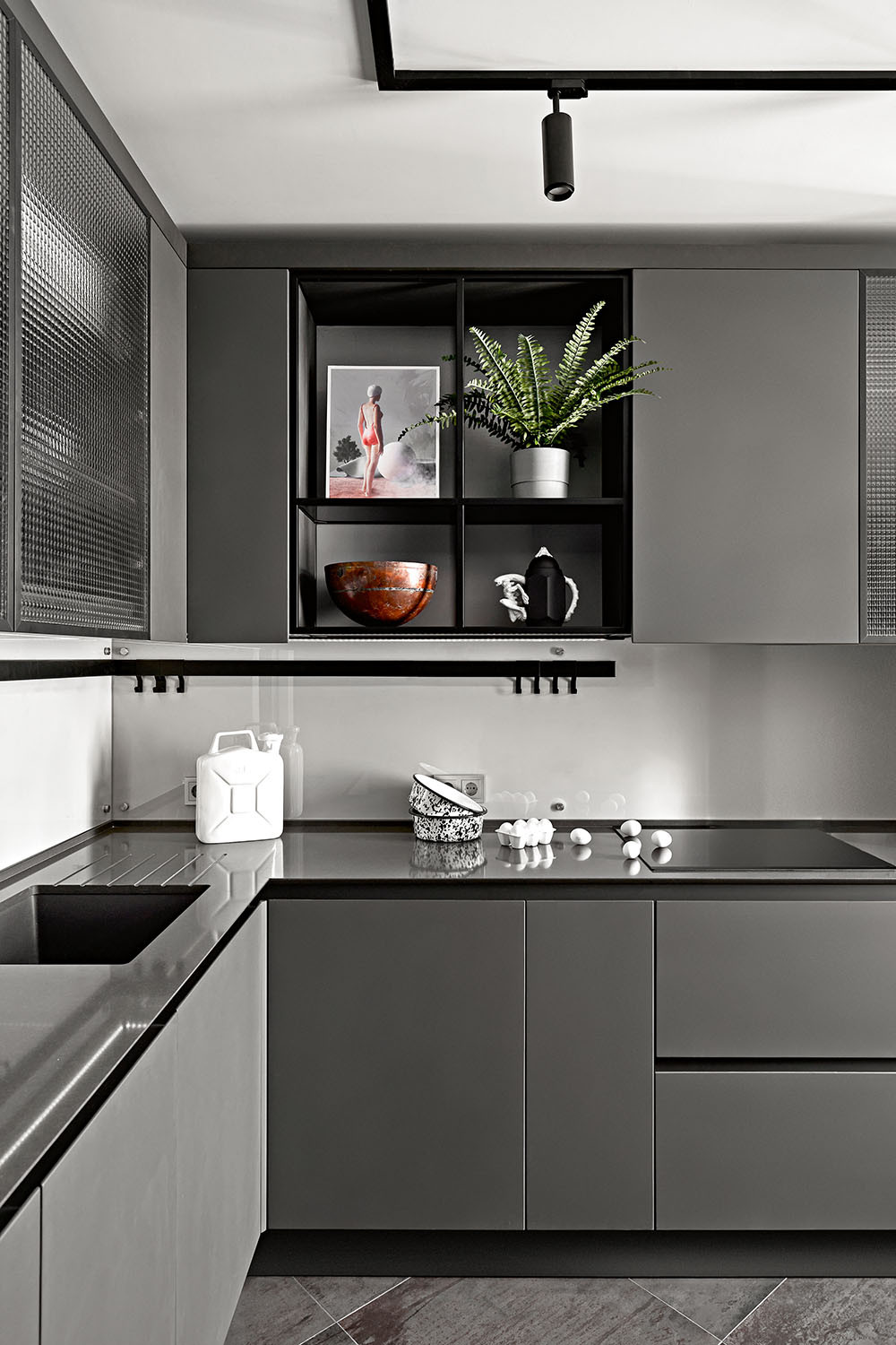 Интерьер квартиры с простой и логичной объёмно-пространственной композицией минималистичен. Декор и предметы искусства объединены общей идеей и намекают на некую фантастическую историю. Удачно найденный баланс разнообразных оттенков серого вне времени и никогда не выйдет из моды, как, впрочем, натуральные отделочные материалы и реализованные дизайнерские и технологические приёмы.