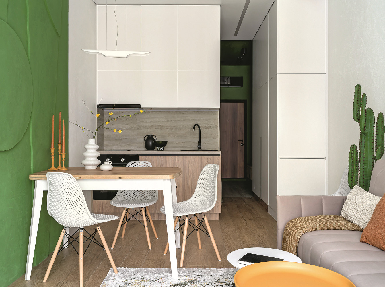 Ремонт. Окна в квартире оставлены от застройщика. В ходе ремонта на пол уложили шумоизоляционный материал (пеноплекс толщиной 5 см) и сделали стяжку (также 5 см). Установили внутрипольные конвекторы. Пол в санузле и коридоре отделали напольной плиткой. Стены в санузле декорировали той же плиткой, что и на полу. Часть стен и дверь отделали краской зелёного оттенка. В зоне столовой на стене укрепили панно из декоративной штукатурки, в прихожей стены частично отделали шпонированными MDF-панелями с фрезерованным геометрическим рисунком. (Всё это достаточно бюджетные решения: например, такие панели продаются в одном из самых известных сетевых гипермаркетов.) Потолок в прихожей декорировали той же краской, что и стены, — это помогло визуально приподнять его, сделать границы стен и потолка неочевидными. В маленьком помещении очень важно сохранить ощущение простора, а для этого как минимум нужны продуманные системы хранения. В «курортную» мини-кухню не помещался холодильник — и его решили разместить в одной из трёх секций большого шкафа напротив. Вытяжку купили скрытого монтажа, она не создаёт лишнего визуального шума, как и кухонные шкафчики без ручек. Гардеробную — помещение между санузлом и кухней — снабдили встроенным шкафом и закрыли портьерой, чтобы не загромождать