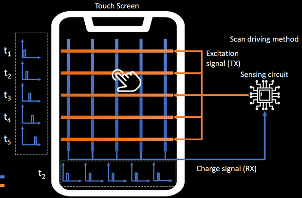 Емкостные сенсорные экраны определяют прикосновения к поверхности по изменению емкости в точке касания из-за перетекания электрического заряда на палец пользователя. Один из распространенных вариантов конструкции емкостных сенсоров состоит из расположенных в виде сетки двух пересекающихся групп электродов, выполненных из прозрачных полупроводниковых материалов, например, из оксида индия-олова. Группы электродов разделены изолирующим промежутком и образуют конденсаторы.