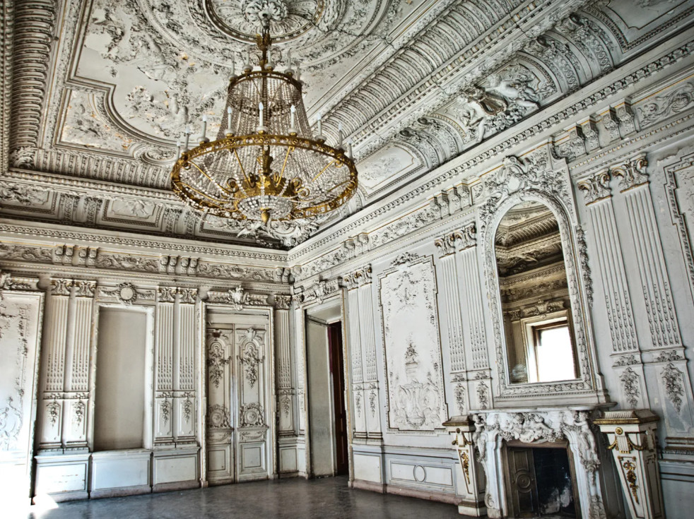 Из гостиной также можно было попасть в танцевальный зал, который называли Белым — за основной цвет отделки. Здесь архитектор придерживался французского стиля, который был популярен при Людовике XV. Стены украшала позолоченная лепнина: изображения купидонов и сатиров, вазы с цветами, венки, женские головки. Здесь сохранились люстра с хрустальными подвесками и мраморный камин со скульптурами амуров.