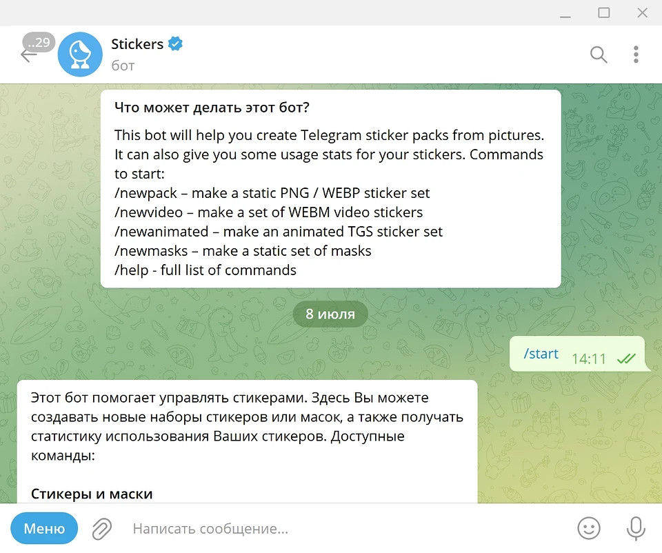 После старта бот выдаст список всех команд, которые вы можете использовать. Чтобы выбрать конкретную функцию, можно нажать на нее в выпавшем сообщении или напечатать в чате и отправить вручную. Для создания нового набора статичных стикеров нам понадобится команда