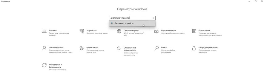Если у вас не появляется в контекстном меню этот пункт, то найти “Диспетчер устройств” можно через “Пуск”. Нажимаем нижнюю кнопку слева на "Панели задач" либо клавишу WIN на клавиатуре и переходим в раздел “Параметры” (значок в виде шестеренки). В поисковой строке сверху пишем “Диспетчер устройств” и переходим в раздел.