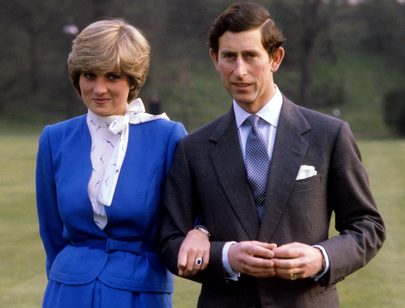 Пара приветствовала фотографов в садах Букингемского дворца. Молоденькая невеста держала жениха под руку и выглядела крайне смущенной. После этого британцы окрестили ее «Застенчивой Ди». Спенсер выбрала костюм Cojana, который буквально накануне в спешке купила в универмаге Harrod's. Роман Дианы и Чарльза вряд ли можно назвать страстным. Они встречались полгода и за это время виделись только 13 раз. Чарльз не заказывал эксклюзивное помолвочное кольцо, как это было принято в аристократических кругах. Вместо этого невеста выбрала его из каталога. То есть, такое же могла позволить себе любая состоятельная британка. Именно поэтому знаменитое украшение с сапфиром даже назвали «кольцо простолюдина».