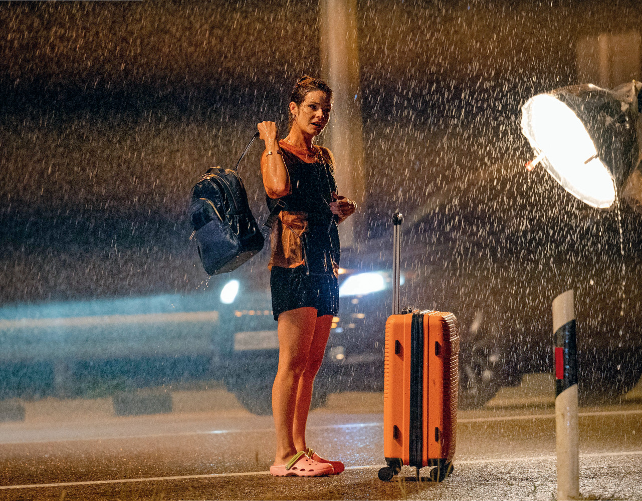 — Можно и так сказать, я же не умею по-другому. Мы снимали сцену клипа, в фильме будет вставная клиповая нарезка под знаменитую песню «Тучи». И моей героине как раз выпала на долю прогулка под дождем в ночи на горной трассе. Мы добрались до съемок этого эпизода в октябре. Даже на юге, в Кабардинке, где мы работали, было уже очень холодно, столбик термометра не поднимался выше трех градусов тепла. Съемочная группа утеплилась, все надели зимние куртки и сапоги, натянули варежки и шапки. А я не могла себе такого позволить. У нас по сценарию стояло лето, да и на черноморском побережье еще пару часов назад светило яркое солнце, люди купались в море. Так что на мне были босоножки, короткие шорты, топ и больше ничего.