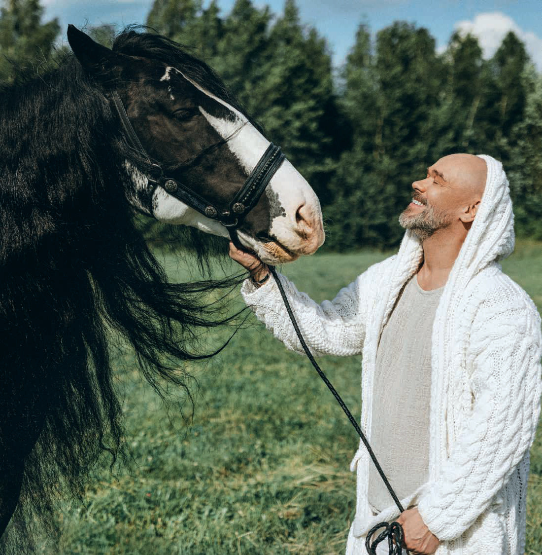 — Конь — это одна из моих стихий. В моем моноспектакле акцент идет именно на бегущем, стремящемся коне. И этот мощный красавец на фото оказался великолепным партнером: он профессионал, а не любитель, очень востребован и много снимается. Ко мне как-то проникся. Мы снимали в Москве на конюшне. Очень интересно рождалась эта история...
