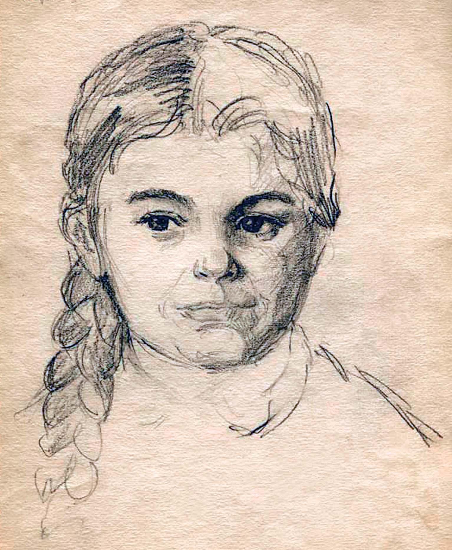 Кроме этюдника и некоторых своих работ папа оставил мой карандашный портрет. На нем темноглазая девочка с толстой косой улыбается, позируя отцу.