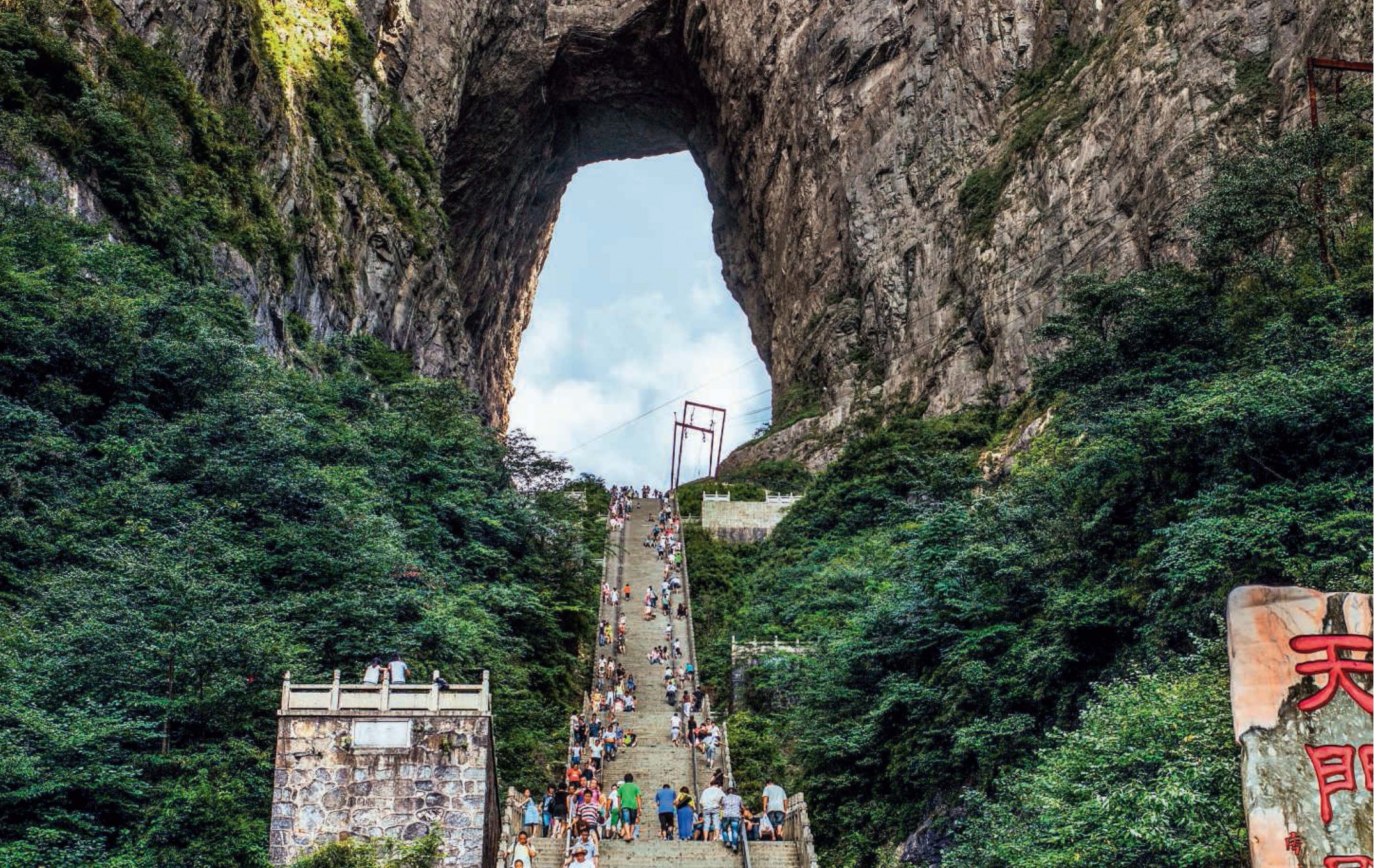 Неземной пейзаж привлекает огромное число туристов со всего света, и власти Китая этим умело пользуются. Первая стеклянная тропа открылась в здешних горах в ноябре 2011 года. Она висит над пропастью глубиной 1400 метров, примыкая с одной стороны к горе Тяньмэнь. Тропа недлинная — всего 60 метров — и является частью маршрута, опоясывающего гору. До этого туристы любовались окружающими пейзажами с традиционных деревянных мостков, которые испокон веков строили крестьяне и монахи в труднодоступных местах. Говорят, однажды смотритель заповедника заметил, что посетители скапливаются у прорехи в поврежденном дощатом настиле и с замиранием сердца вглядываются в бездну под ногами. Он рассказал о своих наблюдениях начальству, предложив закрыть дыру стеклом. Руководство парка оценило идею и даже пошло дальше — так появилась первая прозрачная дорога.