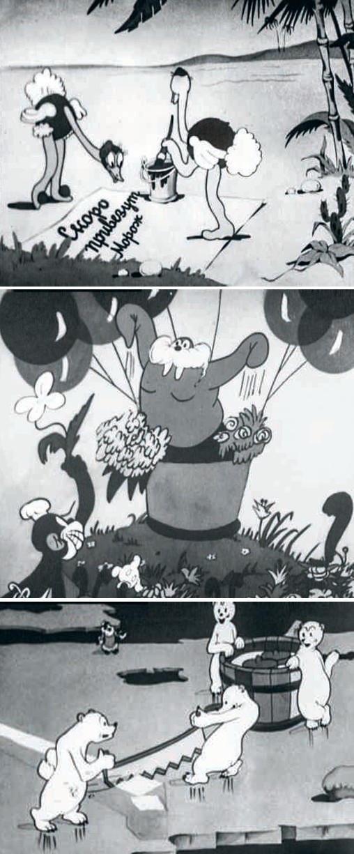 Одной из первых сняли черно-белую историю «В Африке жарко» по сценарию Сергея Михалкова. Это веселый рассказ о том, как выдалось на далеком континенте особенно жаркое лето и все животные — от обезьян до бегемотов — очень страдали. Одна находчивая мартышка решила отправиться на Северный полюс, чтобы привезти оттуда «что-то ледяное». Вернулась она в сопровождении моржа и с целым ящиком эскимо. Изнывающие от зноя африканские зверушки были спасены, а морж с горой экзотических фруктов отправлен домой. Первые опыты авторов молодой студии тогда, в тридцатые, не дошли до широкого зрителя, однако студия продолжила работу, пробуя свои силы как в цветной, так и в черно-белой палитре.