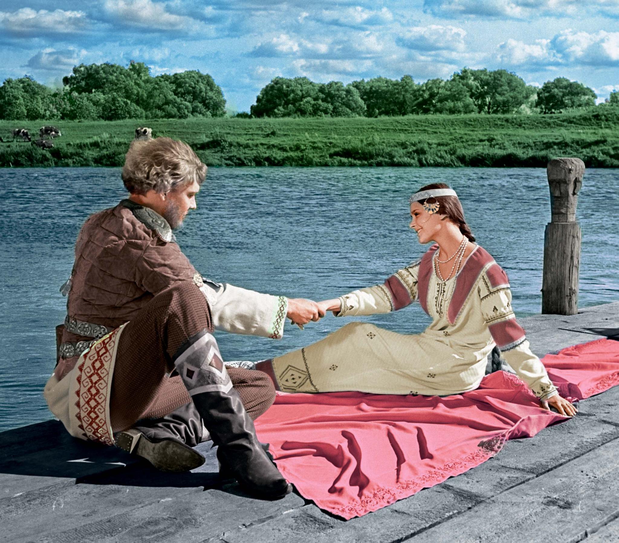 Это должны были быть финальные кадры: мой Финист всех победил, вскочил на коня, впереди посадил Аленушку, и они въехали в белокаменный город. Меня переодели в алый плащ. И я в этом плаще стою на том же месте, где недавно «пахал поле». На берегу Москвы-реки, на краю косогора, а его еще полили, чтобы трава блестела.