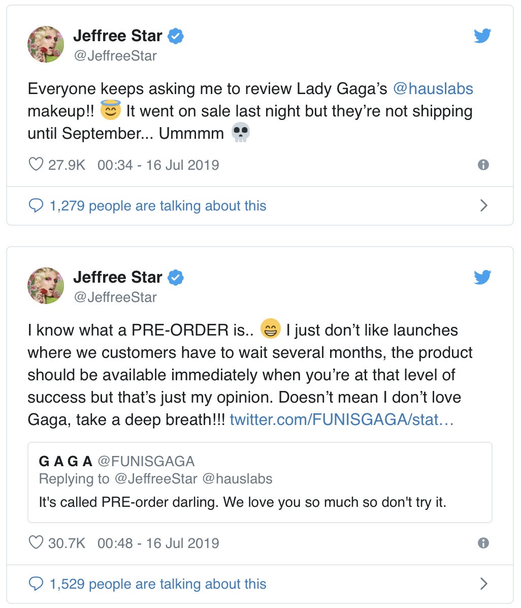 Основатель Jeffree Star Cosmetics сразу же прокомментировал данную ситуацию: «У каждого своё мнение, но мне как любителю косметики и потребителю хочется протестировать продукт прямо сейчас. Если он в продаже, значит, он должен быть доставлен к моей двери с помощью Amazon Priming’ в эту же секунду. Но нет, это предварительный заказ...» Нарвавшись на толпу разъяренных фанатов Леди Гаги в интернете, Джеффри решил объяснить, что его негатив направлен лишь на бренд: «Это не означает, что я не люблю Гагу. Сделайте глубокий вдох!»