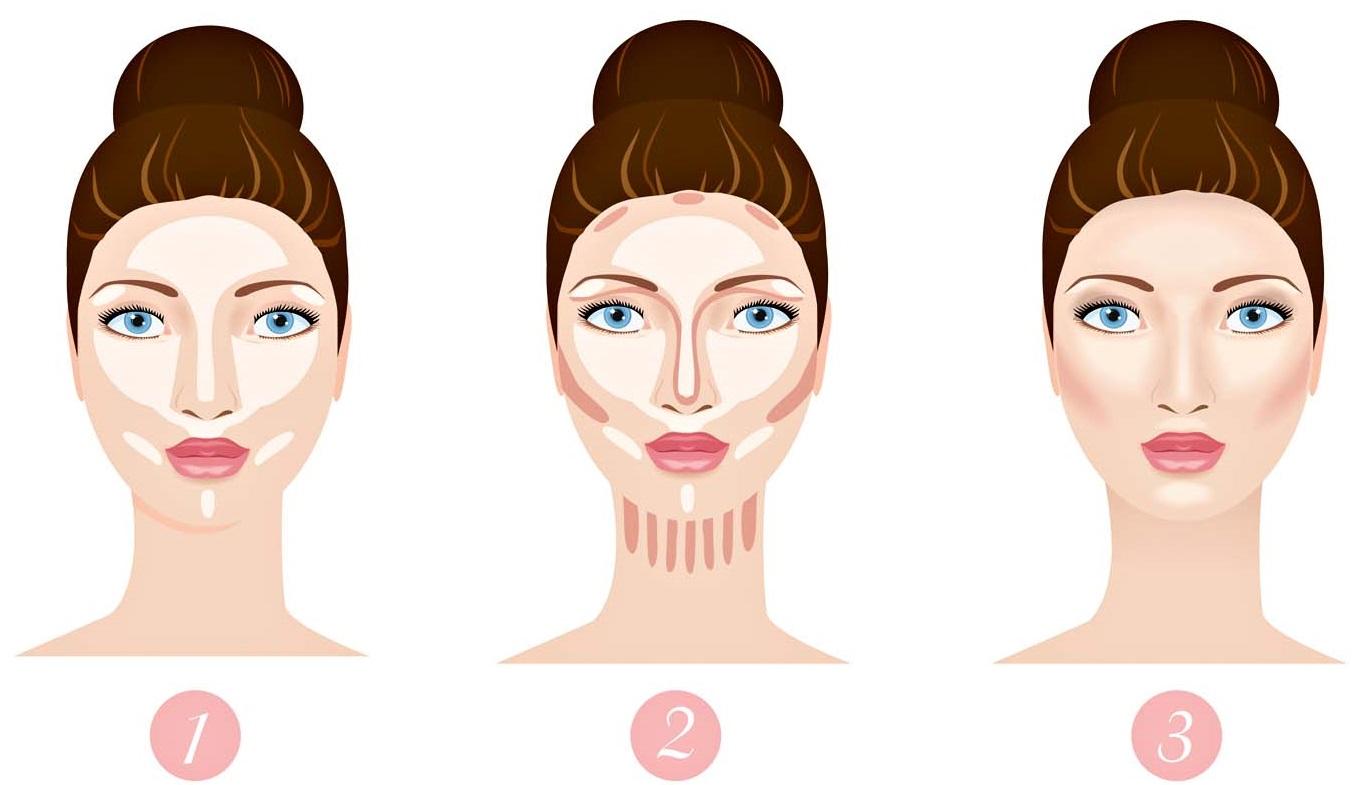 позволяет приблизить овал лица к идеальному с помощью темных и светлых тональных средств. Главный принцип нанесения – светлые корректирующие средства наносятся на выступающие части лица: лоб, надбровные дуги, кончик носа, яблочки щек, подбородок, центр верхней губы, а темные – по границе лица и под скулами.