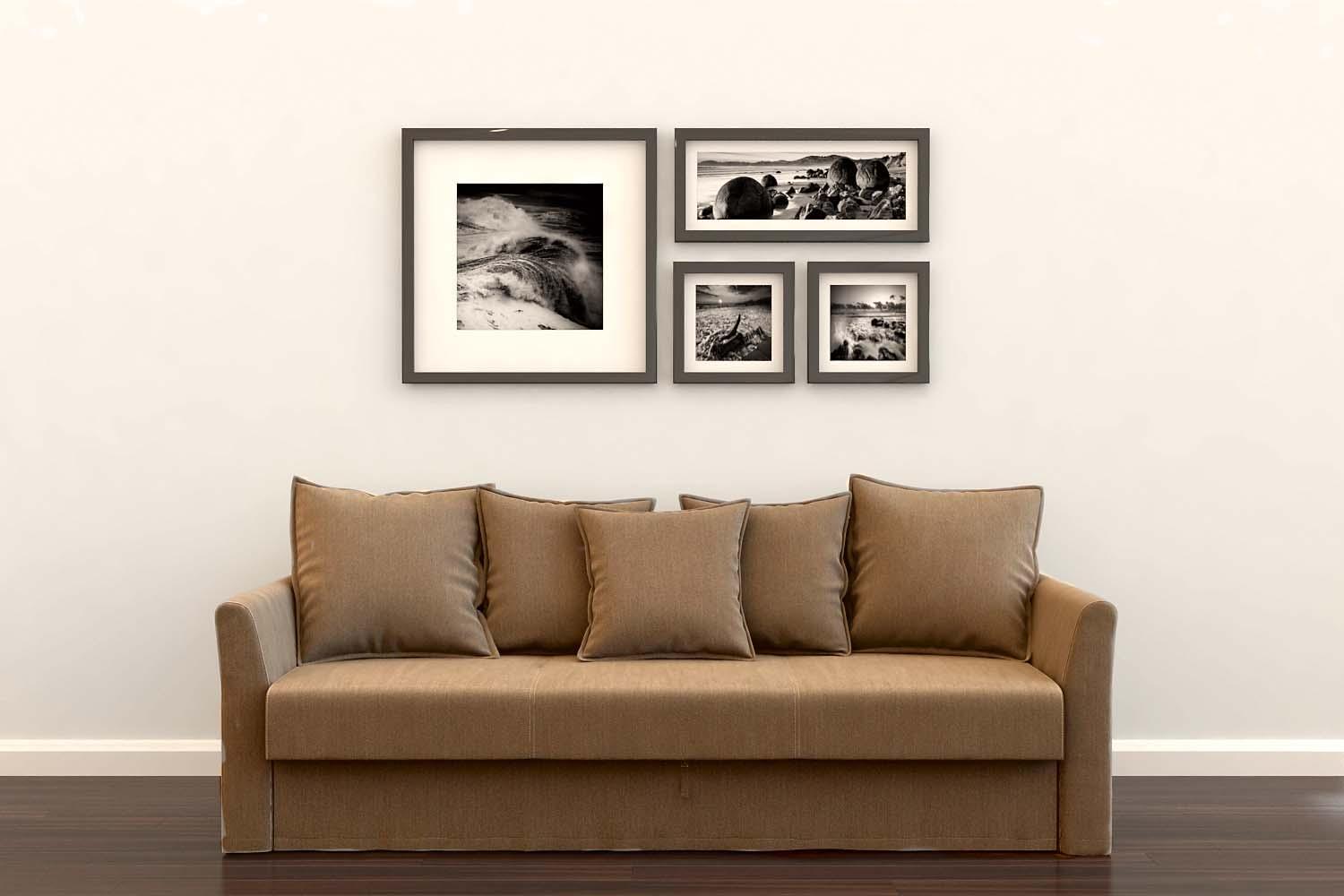 Вариант для тех, кто не хочет рисковать. Понадобится выбрать главную, самую большую рамку и дополнить ее идентичными, вписав в прямоугольник в пределах высоты главной рамки. Такая композиция хорошо подойдет для лаконичного интерьера в современном стиле и будет удачно смотреться над диваном со строгими линиями.