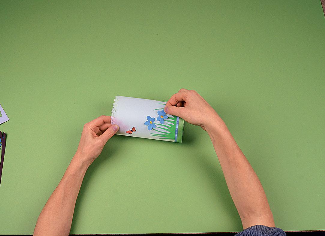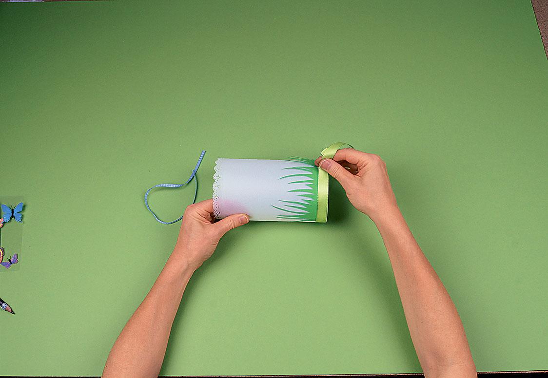 Шаг 3 Оклей стаканы прозрачной бумагой так, чтобы бордюр оказался сверху. По нижнему краю приклей тейп-ленту.