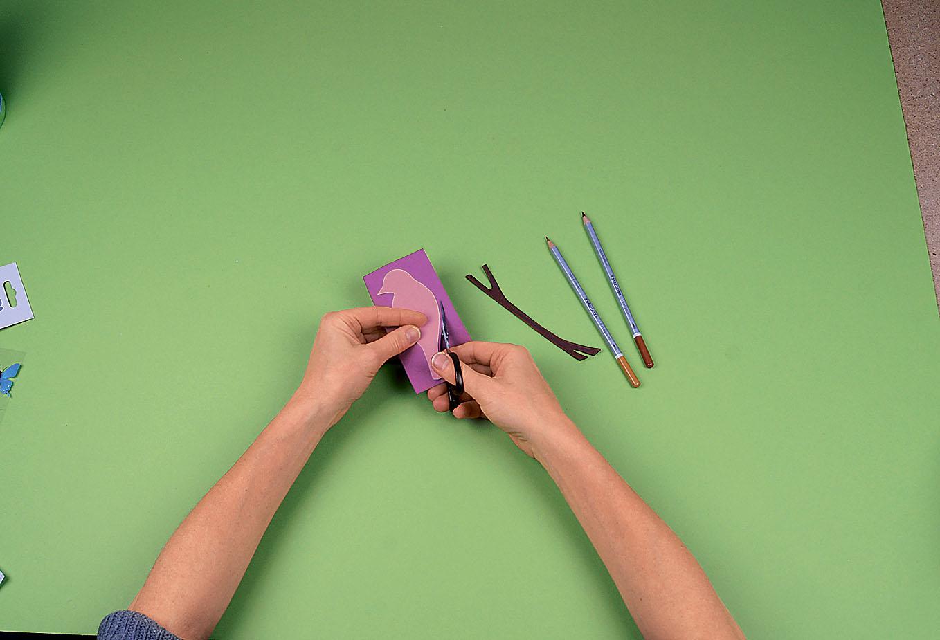 Шаг 2 Вырежи из цветной бумаги фигуры птиц, ветви, траву и цветы. Подготовь наклейки-бабочки.