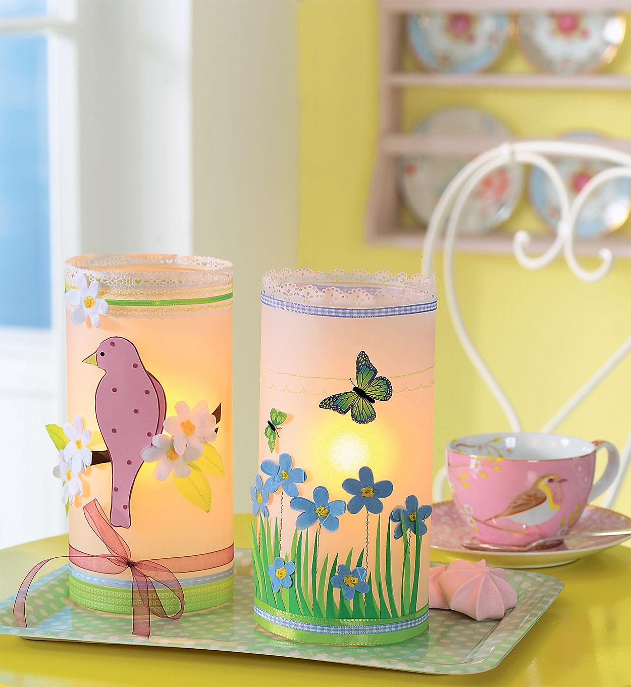 • Два высоких прозрачных стакана • цветная бумага • белая прозрачная бумага • штамп для вырезания цветочного или кружевного бордюра • самоклеящаяся флористическая тейп-лента