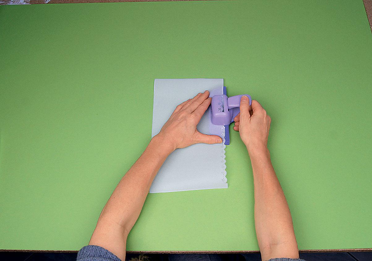 Шаг 1 Вырежи из прозрачной бумаги два прямоугольника для обертывания стаканов. Обработай один край штампом.