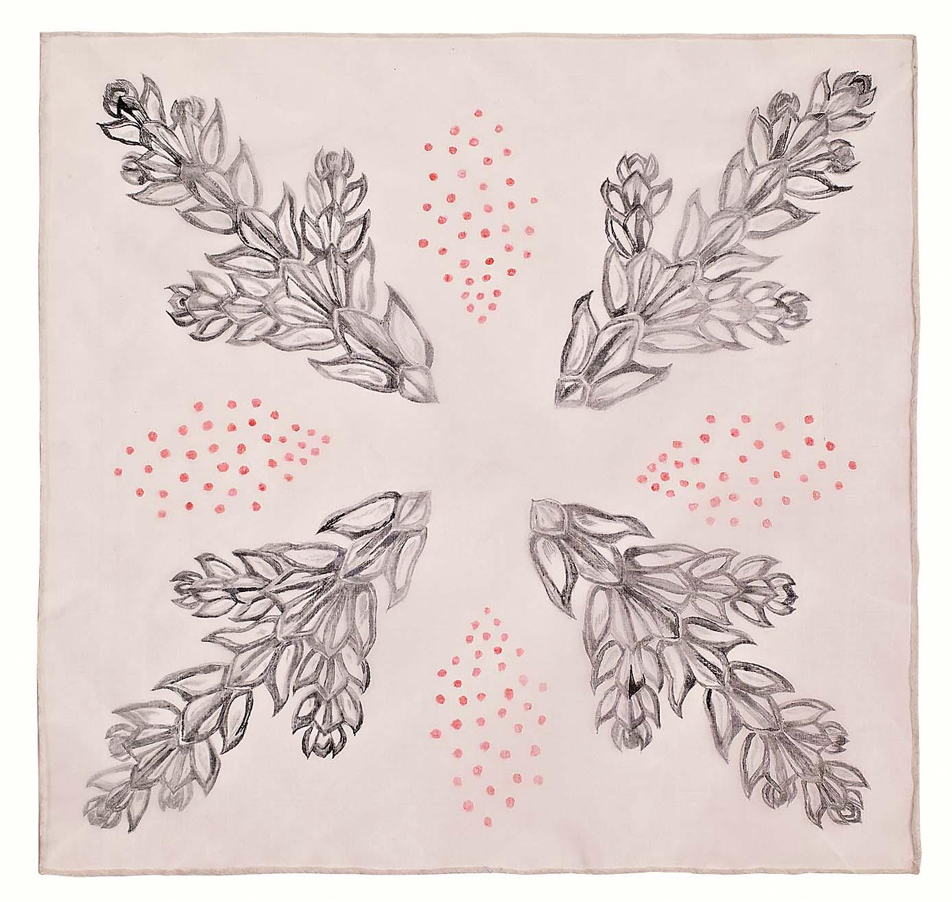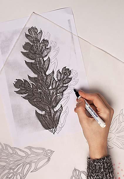 1. Перед началом работы обработай края платка. Подверни срезы вдвое и наметай. Затем отстрочи на швейной машинке. Прогладь утюгом ткань через марлю, чтобы полностью ее выпрямить. Подложи шаблон с изображением под ткань и переведи контуры рисунка маркером на платок.