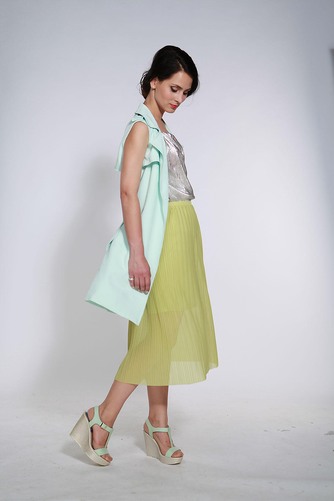 Создай романтичный образ с жилетом. Дополни комплект с плиссированной юбкой топом с металлическим блеском. Юбка из полупрозрачной ткани придаст образу женственности.