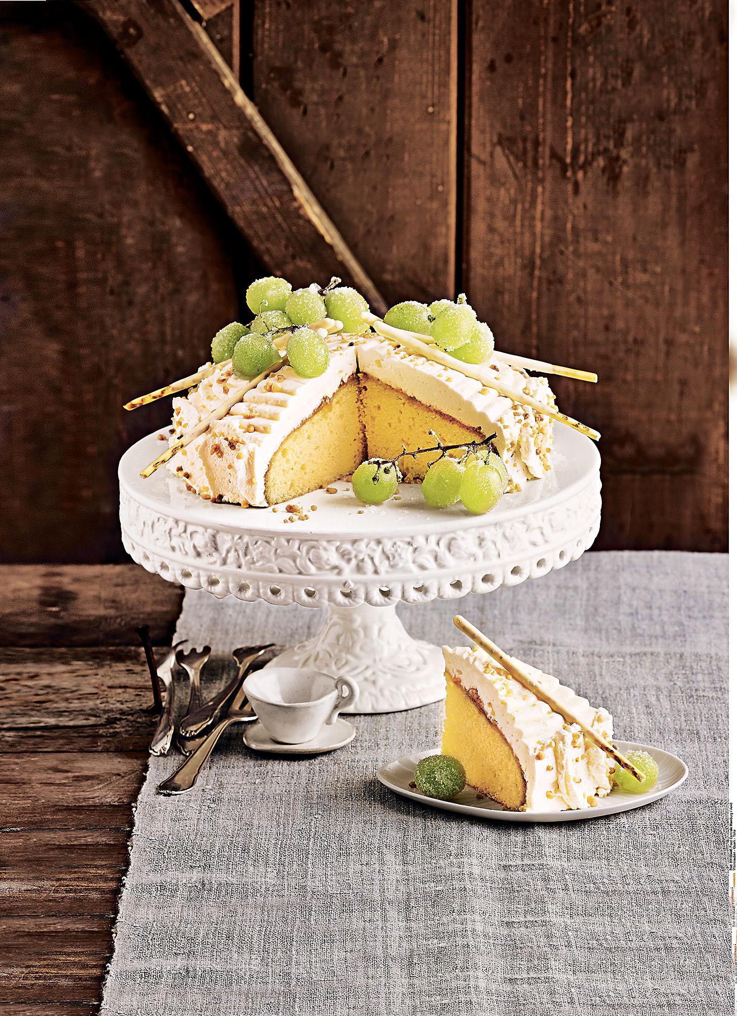 •5 яиц •250 г сахара •1 пакетик ванильного сахара •250 мл растительного масла •400 г муки •1 пакетик разрыхлителя. Для крема и украшения: •400 г белого винограда •250 г сахара •15–20 г желатина •500 г нежирного творога •тертая цедра 1 апельсина •400 мл сливок (жирность 33%)