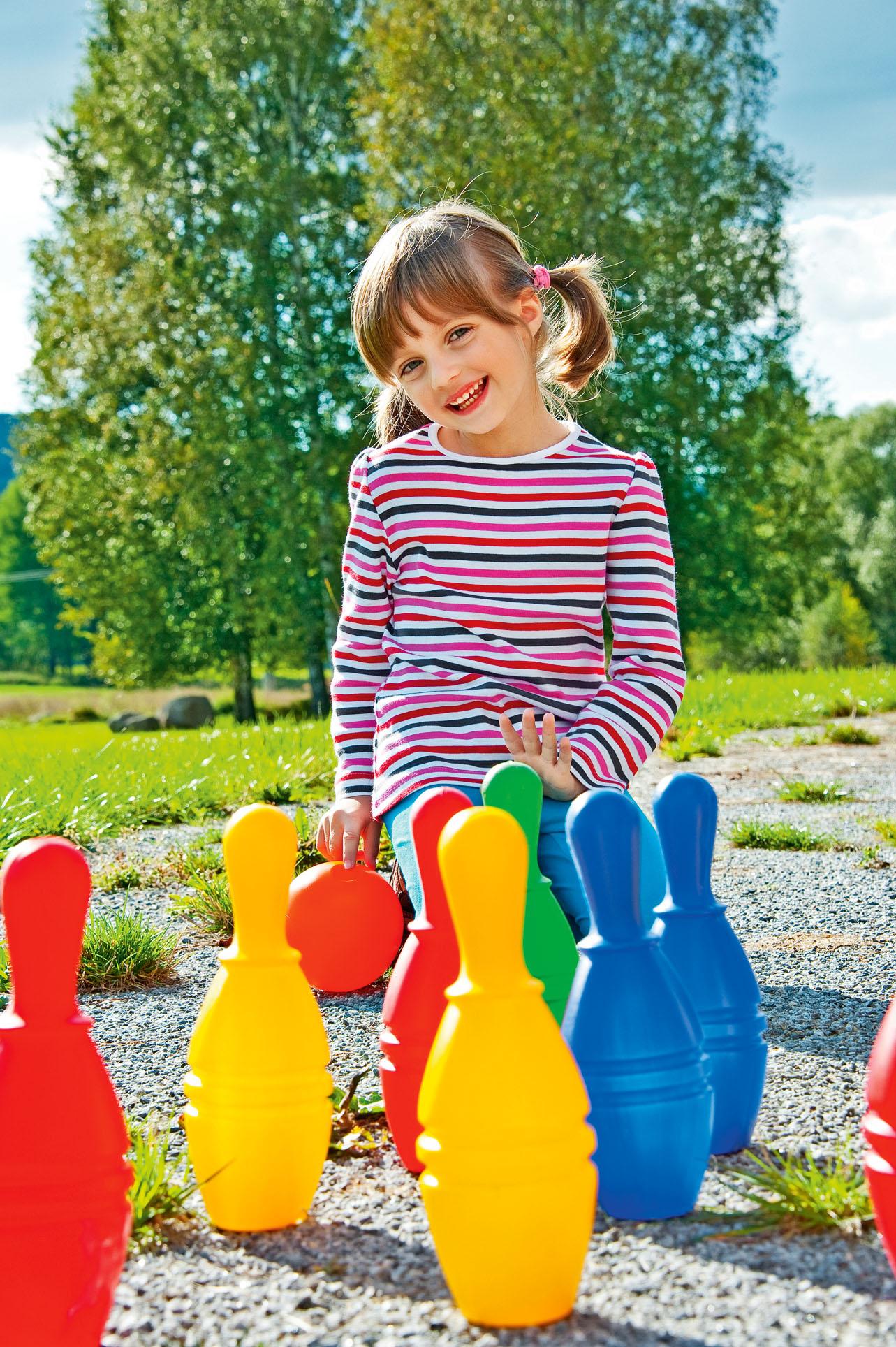 Конечно, можно купить пластиковый набор для боулинга в магазине. Но и самой все сделать легко. Покрась в разные цвета 10 пластиковых бутылок, дай им высохнуть, а потом наполни водой (для большей устойчивости). Кегли готовы! В качестве шара подойдет простой теннисный мяч. Кстати, подобных игр «на выбивание» в мире много. Американский боулинг, пожалуй, самый простой. Но есть более сложные с целым набором правил: французский петанк и русские городки.
