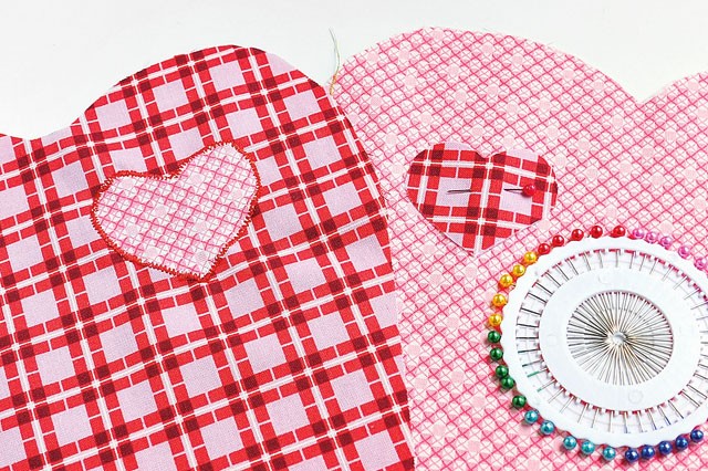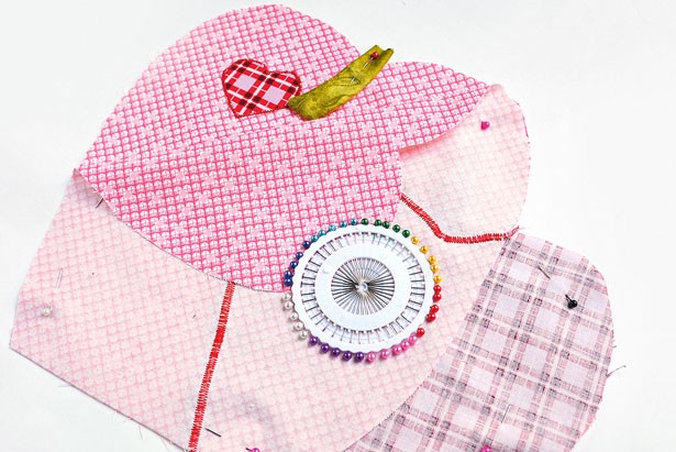 5. К яблокам прикалываем иглами сердечки, сместив их от центра. Притачиваем сердечки по контуру мелким зигзагом.