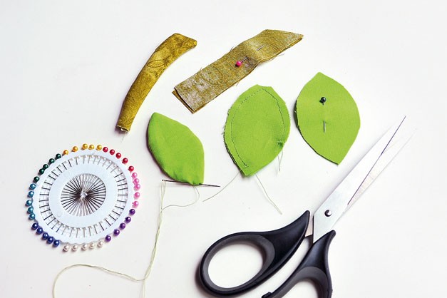 6. Складываем лицом к лицу детали веточек и листиков, скалываем иглами для закалывания. Стачиваем, оставив отверстия, и выворачиваем. Непрошитый край зашиваем вручную потайным швом.