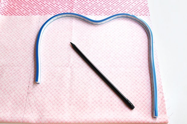 1. Отпариваем ткань. На ткани рисуем яблоко размером 25х25 см и маленькое сердечко 4х4 см.