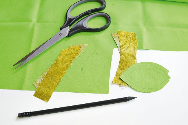 4. Из разных тканей выкраиваем 6 деталей для 3 листиков по 5 см и 4 детали для 2 веточек с припусками на швы.