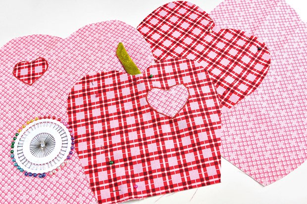 3. Вырезаем яблоки с припусками на швы по 1 см, а сердечки по контуру без припусков.