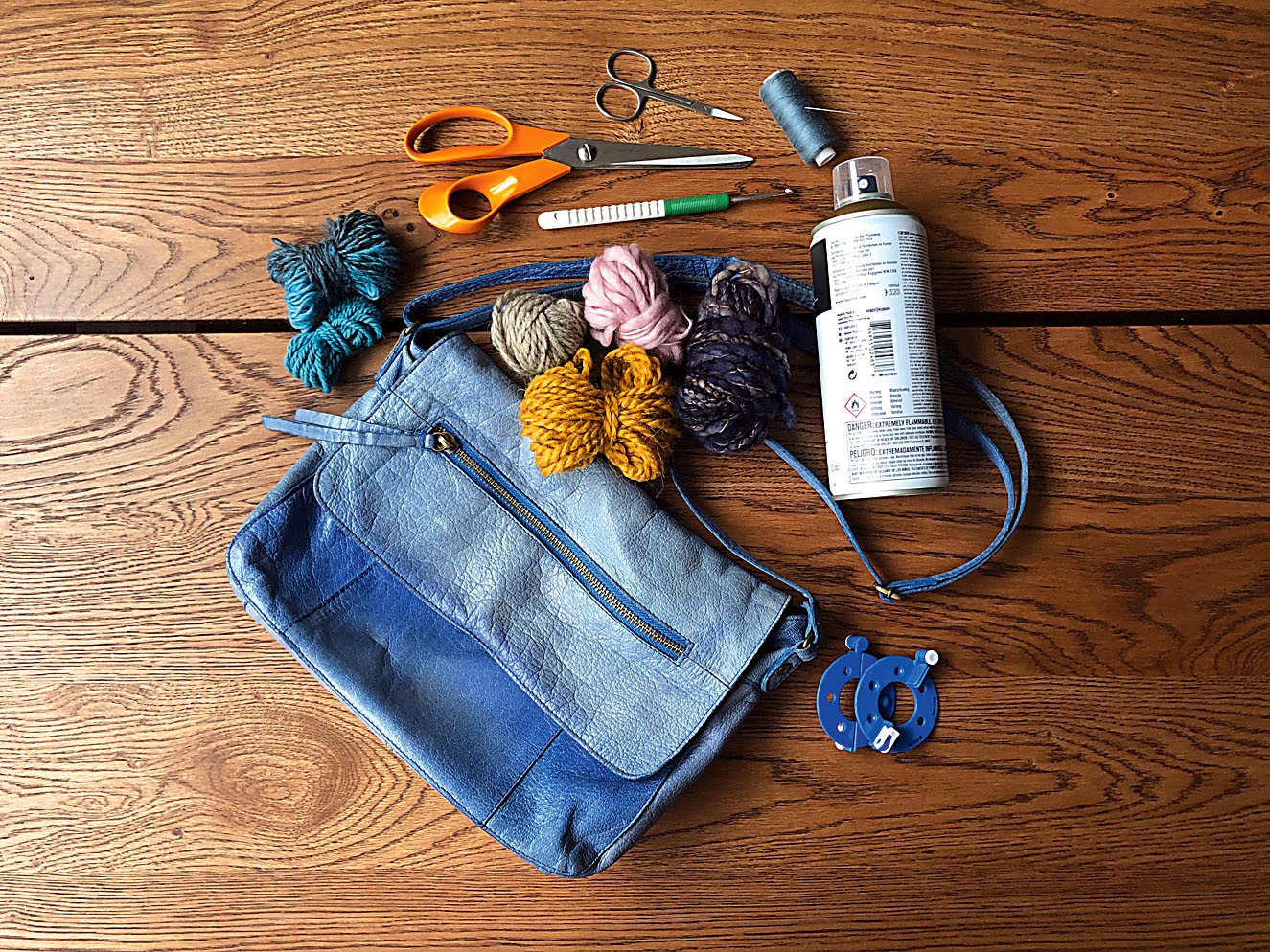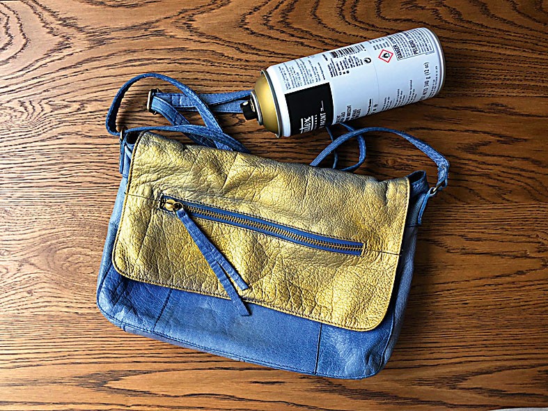 Если твоя сумочка местами выгорела или попросту обтерлась, замаскировать это поможет краска в аэрозоли – выбери смелый цвет для контраста или сияющие оттенки золота или серебра, как это сделали мы. Дай краске просохнуть.