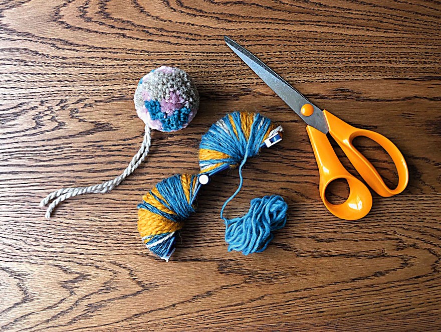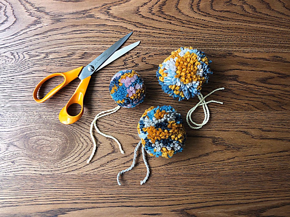 Самое ответственное дело – стрижка помпонов. Для этого хорошо подойдут большие портняжные или кухонные ножницы. Начинай с формирования идеального шара, снимая по 2–3 мм торчащих кончиков пряжи. Наберись терпения: чем больше времени ты проведешь за стрижкой, тем лучше будет результат, обещаем.