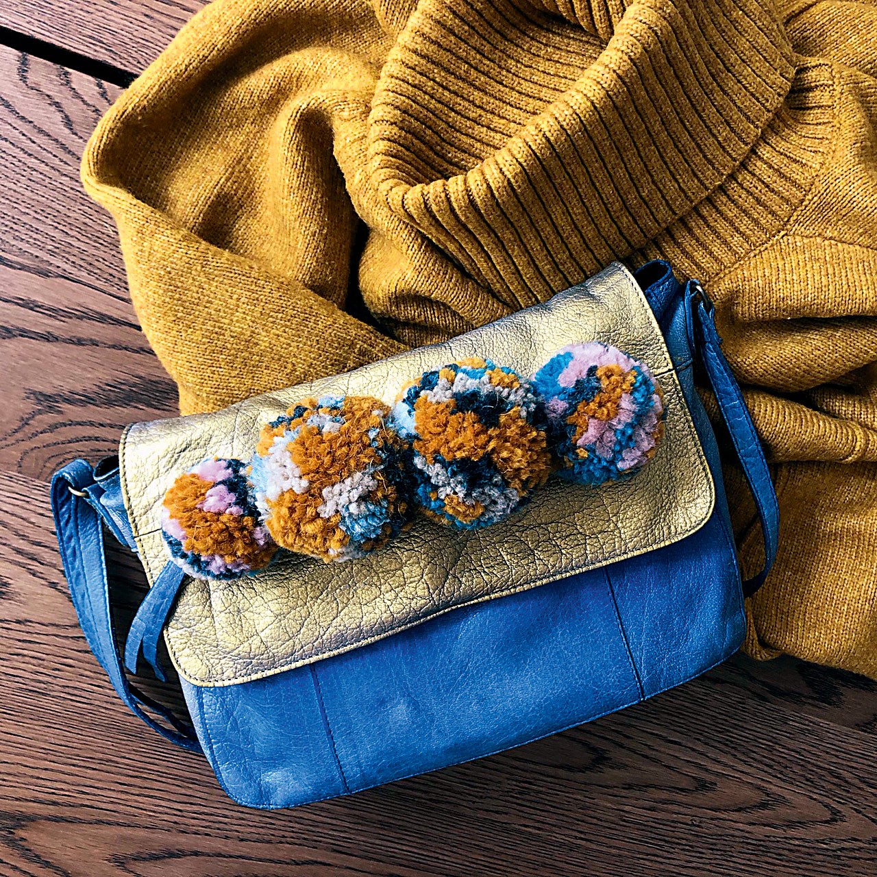 Готовые помпоны размести и закрепи на сумке с помощью иглы и ниток в задуманном порядке. Мы, к примеру, пришили их на верхний клапан, чтобы спрятать неработающую молнию.