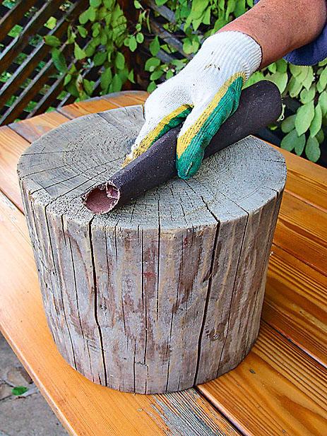 1. Прошкурь пни крупнозернистой наждачной бумагой.