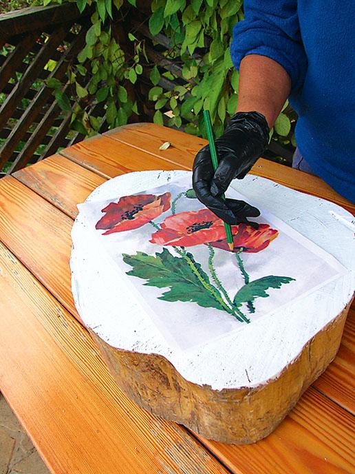 5. Приложи рисунок к боковой поверхности пня-пуфика заштрихованной стороной вниз и, обводя простым карандашом все линии рисунка, переведи его на поверхность. Точно так же переведи рисунок на пень-столешницу.