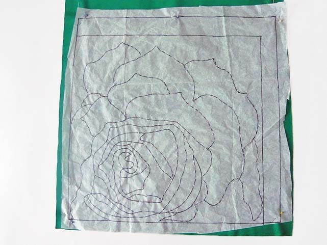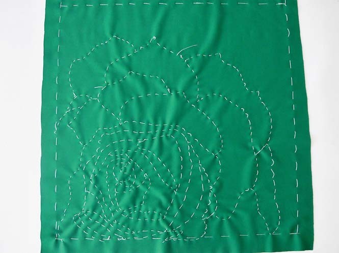 3. Выполняем рисунок на зеленой наволочке. Для этого возьми связанный шнур«гусеничку», приложи к ткани (по заданному контуру) и пришей белыми нитками очень мелкими стежками.