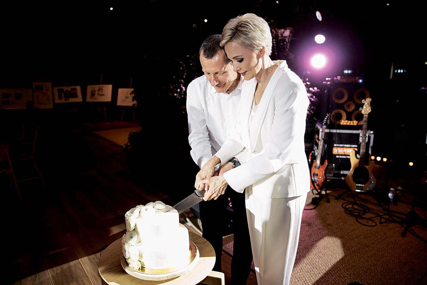 Ну, мне не 20 лет, чтобы были платье, фата. В таком наряде я ощущала бы себя неловко. А невеста в костюме – это очень даже стильно. Наряд нашла сразу. Приехала на примерку и влюбилась. Кольца тоже сама выбирала. А вот организационные моменты мы доверили профессионалам. Нашли хороших ребят, которые помогли все сделать так, как нам хотелось – без тостов и глупых конкурсов. Мы с Андреем решили, что этот вечер должен быть посвящен не только нашей свадьбе, но в первую очередь нашим друзьям. Поэтому торжество открыли одой, в которой рассказали, чем нам дорог каждый из присутствующих. Ее мы написали вместе. Еще придумали, что вместо традиционных поздравлений все будут рассказывать истории, связанные либо с нами, либо с кем-то из гостей, и обрывать их на самом интересном месте – финал нужно было разгадать. Но по поводу одной задумки я особенно волновалась. На входе мы каждому выдали по фломастеру одного из цветов радуги. Получилось семь команд – по числу полных лет, что мы вместе с Андреем. Гостям предстояло сделать стенгазету, посвященную одному из этих годов. Вспомнить, какие события тогда произошли, а остальные должны были угадать, что это за год. Компания у нас собралась возрастная, и я думала, что затея провалится. Но нет, все окунулись в творчество и воспоминания. А потом танцевали до утра и еще долго писали: «Спасибо, было здорово!»