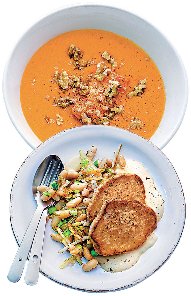 НА 2 ПОРЦИИ: • 300 г картофеля • 100 г ветчины • 300 мл овощного бульона • 300 мл томатного сока • 100 г сливочного сыра • 2 ст. л. айвара • 40 г грецких орехов • 1 ст. л. оливкового масла