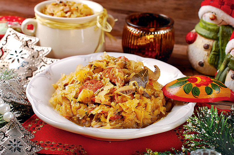 - Добавить лук и подрумянить его. Положить вырезку, перемешать и жарить, помешивая, 10 мин. Затем добавить жареные ребра, квашеную и свежую капусту, ягоды можжевельника, всыпать сахар, посолить, поперчить и перемешать. Влить сухое белое вино и запекать в духовке около 1,5 ч при 180°.