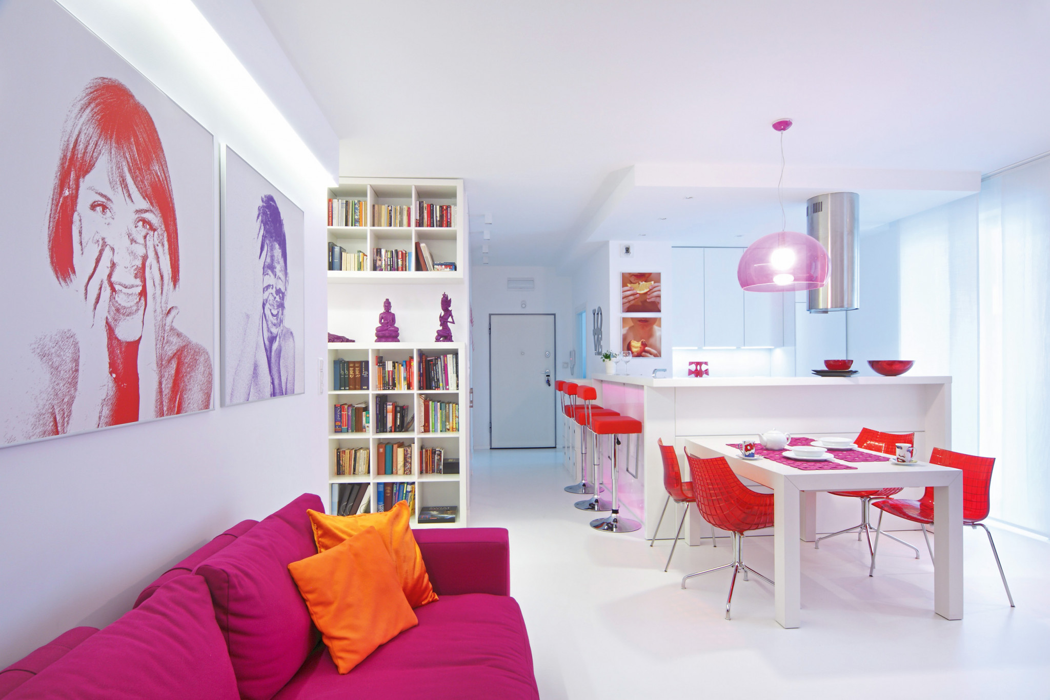 Ее можно объединить с зоной кухни, создав единый и очень компактный кухонно-столовый островок. Важная деталь – мощная цилиндрическая вытяжка над встроенной варочной панелью, которая одновременно является и элементом дизайна.