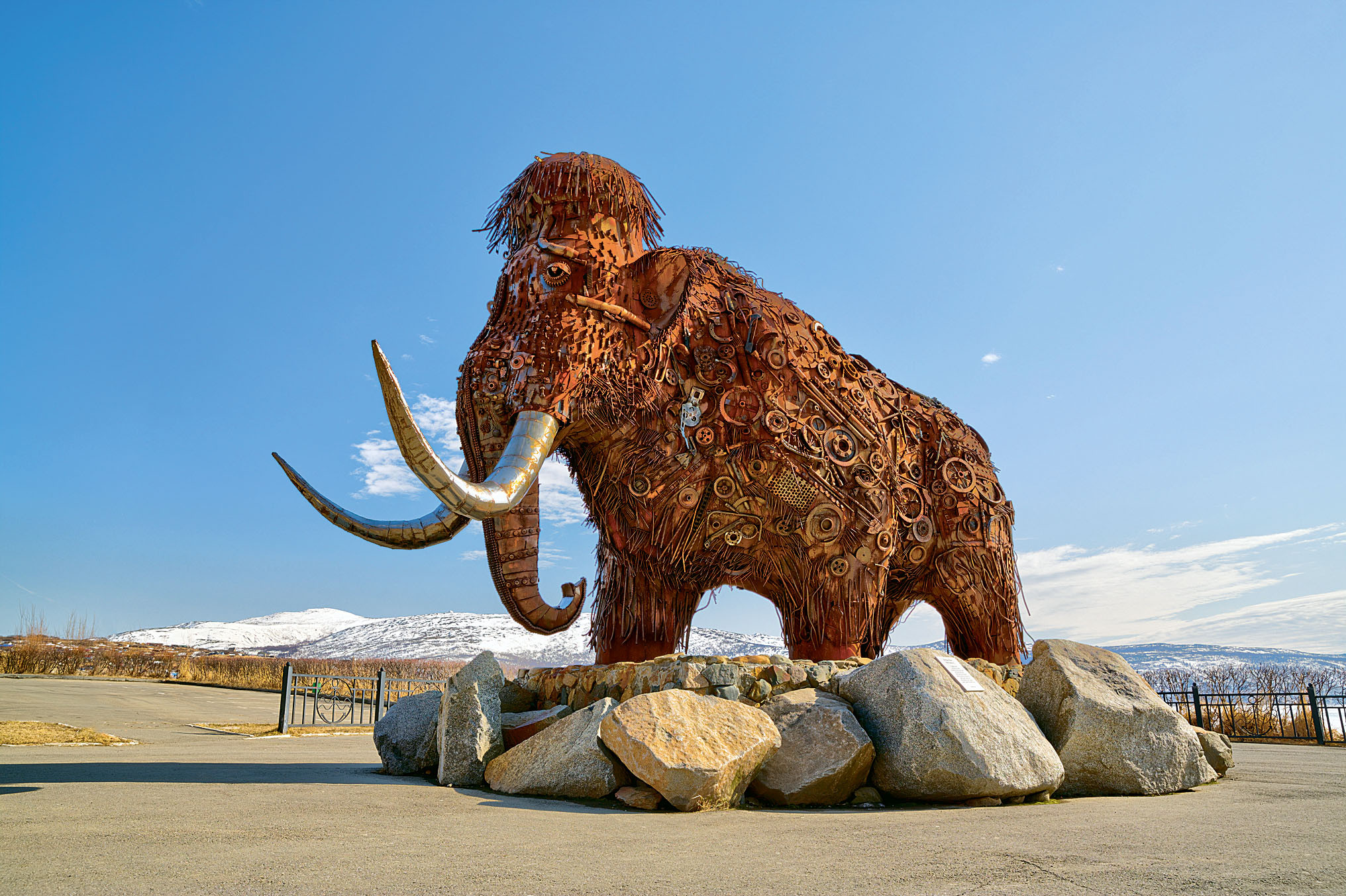 Гигантский мамонт из металлолома возвышается у магаданской бухты Нагаева. Официально он не просто мамонт, а скульптура «Время». «Шкура» мамонта покрыта шестеренками, винтиками и подшипниками и напоминает элементы часового механизма. Идея такого образа пришла скульптору Юрию Руденко, когда на заброшенном прииске он увидел кости мамонта вперемежку с металлическими предметами труда. Работа над скульптурой заняла четыре года. Большую часть времени Юрий собирал металлолом для будущего гиганта, а соединил детали всего за три месяца. Вес готовой скульптуры – более 6 тонн, а высота – 5 метров.