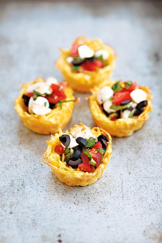 3. Получившуюся массу распределить по стенкам и дну формочек, смазанных любым жиром. Запекать около 15 мин. Осторожно вынуть и дать остыть. В корзиночки можно разложить салат с моцареллой, оливками и помидорами черри.