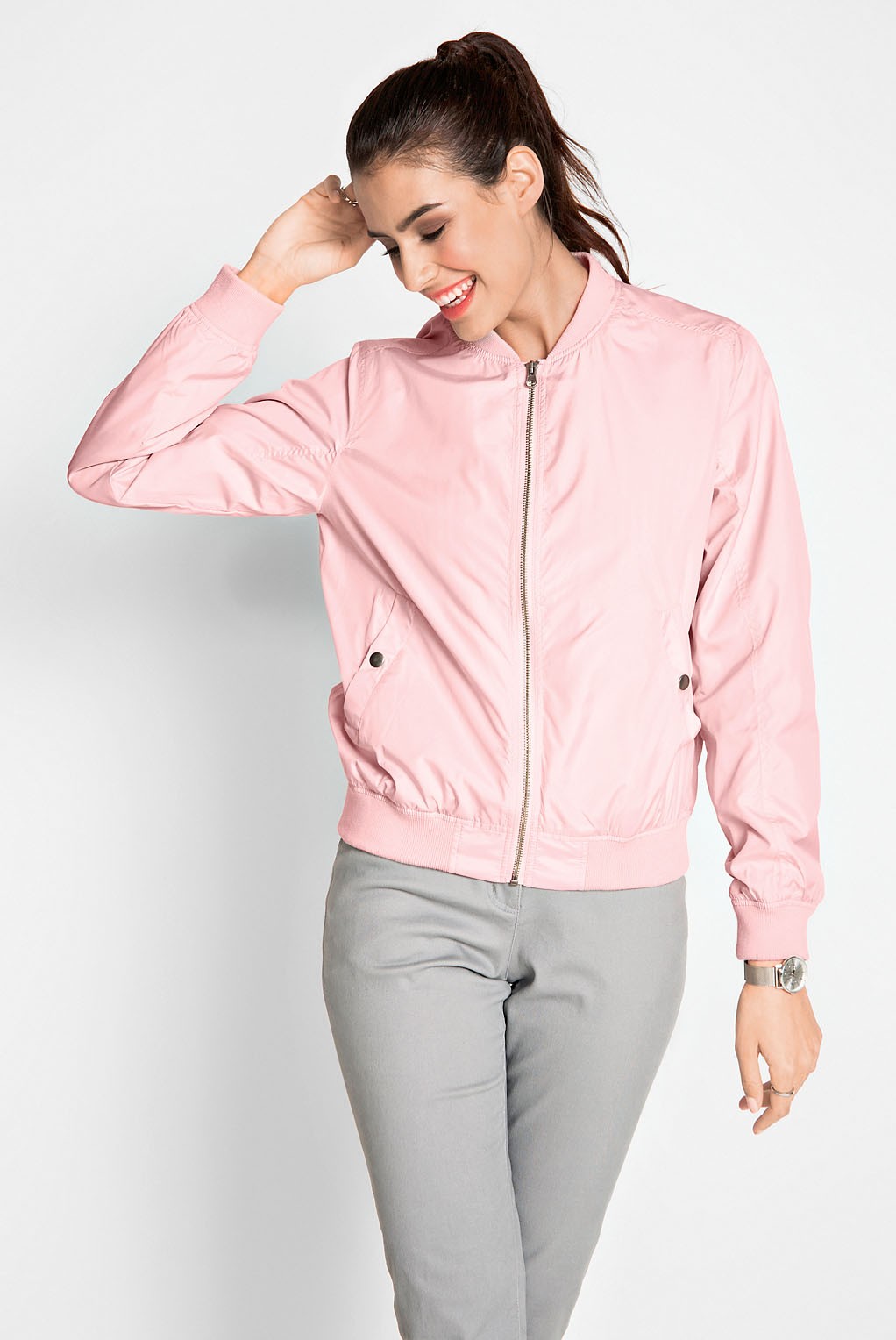 Ветровка в базовых тонах станет стильной заменой жакету в сдержанном деловом наряде. Чтобы комплект смотрелся гармонично, подбирай бомбер в тон топу.