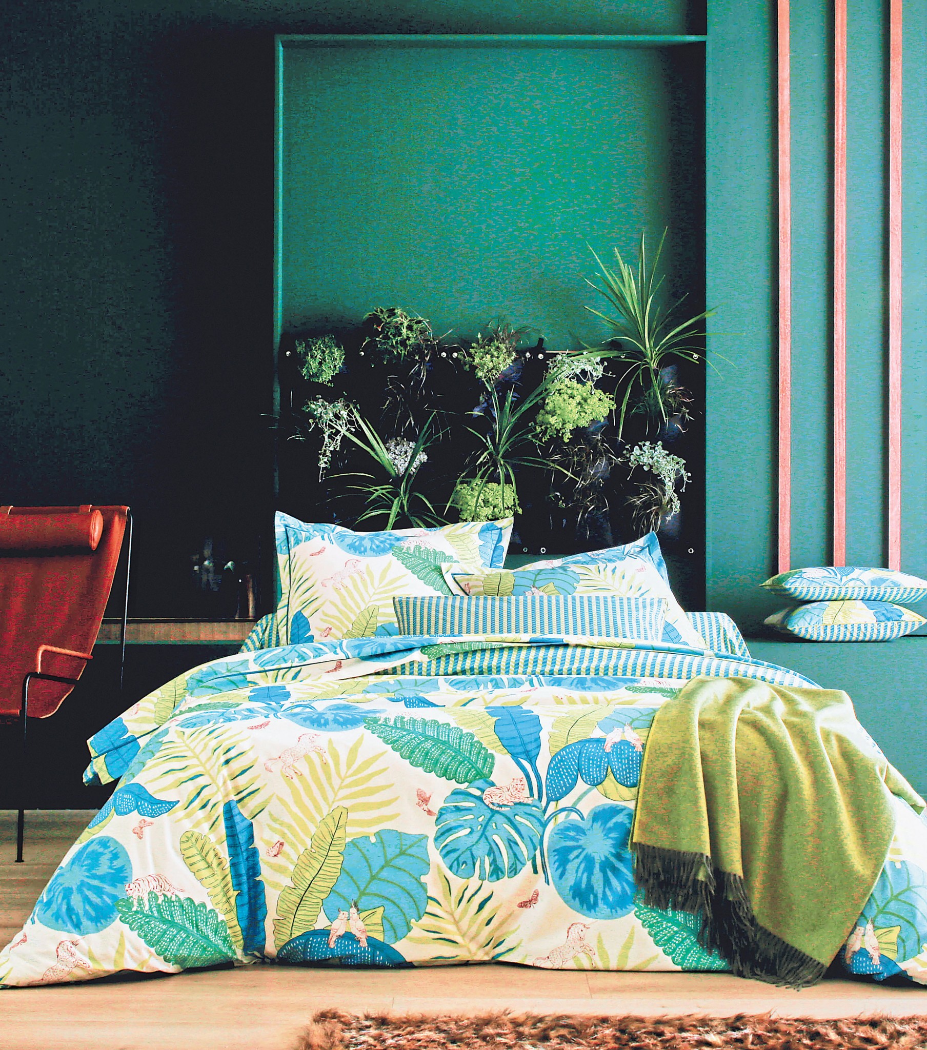 Озеленение – актуальный тренд в интерьерном дизайне. Но для оформления пространства за изголовьем живые растения использовать не рекомендуется. Однако это не повод отказаться от идеи, ведь можно создать зеленую композицию из искусственных растений, которая будет украшать приватную зону независимо от времени года. В современном исполнении листья и бутоны выглядят настолько естественно, что их сложно отличить от натуральных.