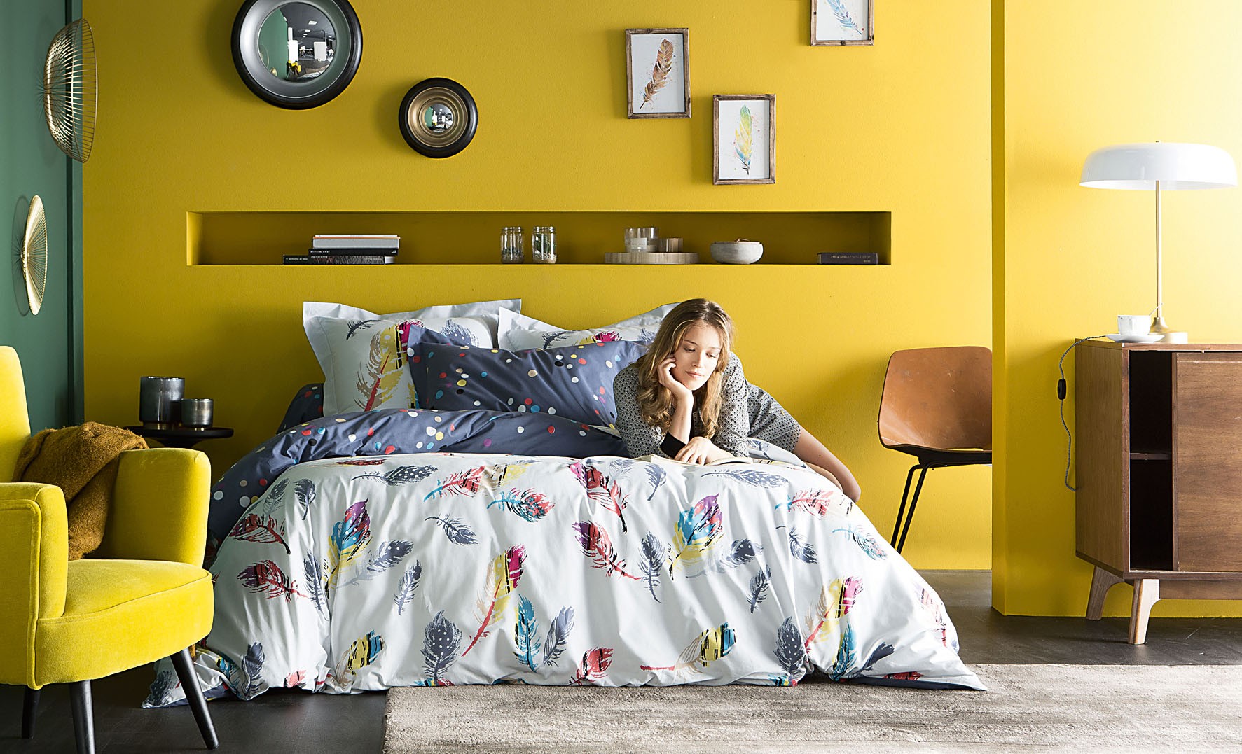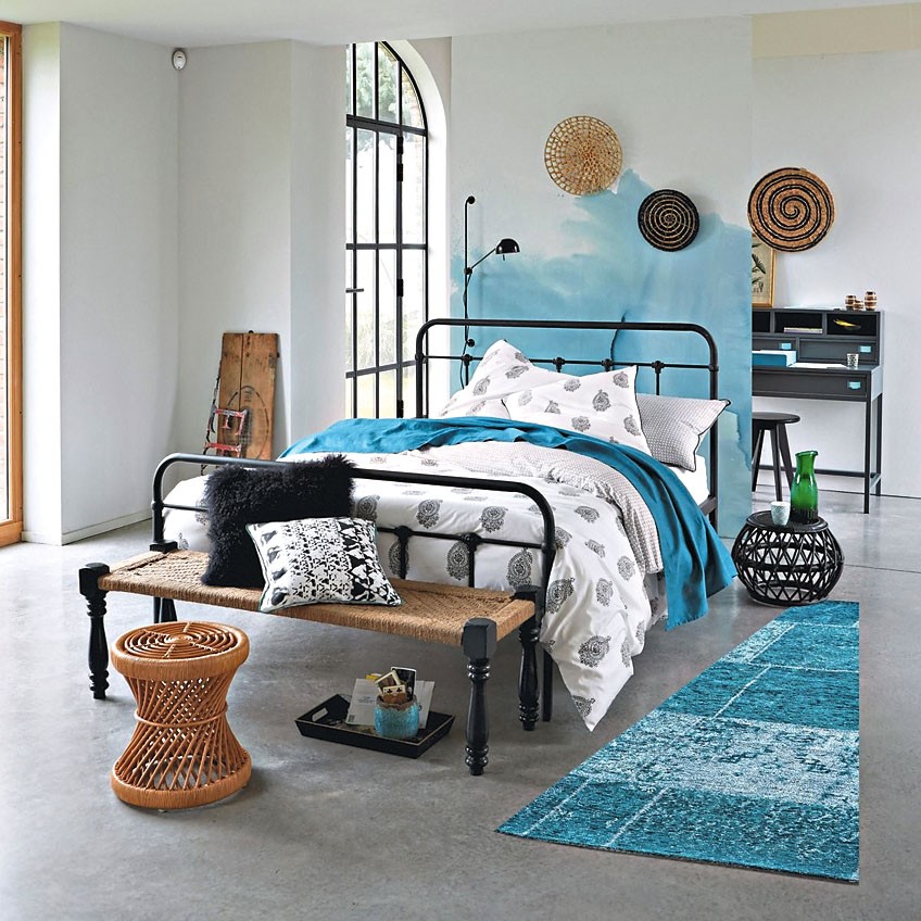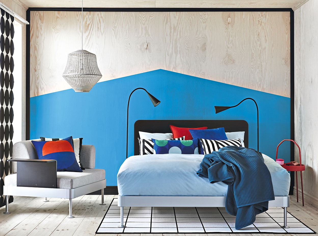 Одно из креативных решений – использовать плоскость за изголовьем в качестве живописного холста. Стиль зависит от твоего вкуса. Это могут быть геометрические абстракции из блоков разного цвета (для создания ровных линий понадобятся краски, кисть и малярный скотч) или акварельные рисунки, имитирующие на стене размытые переходы между оттенками.