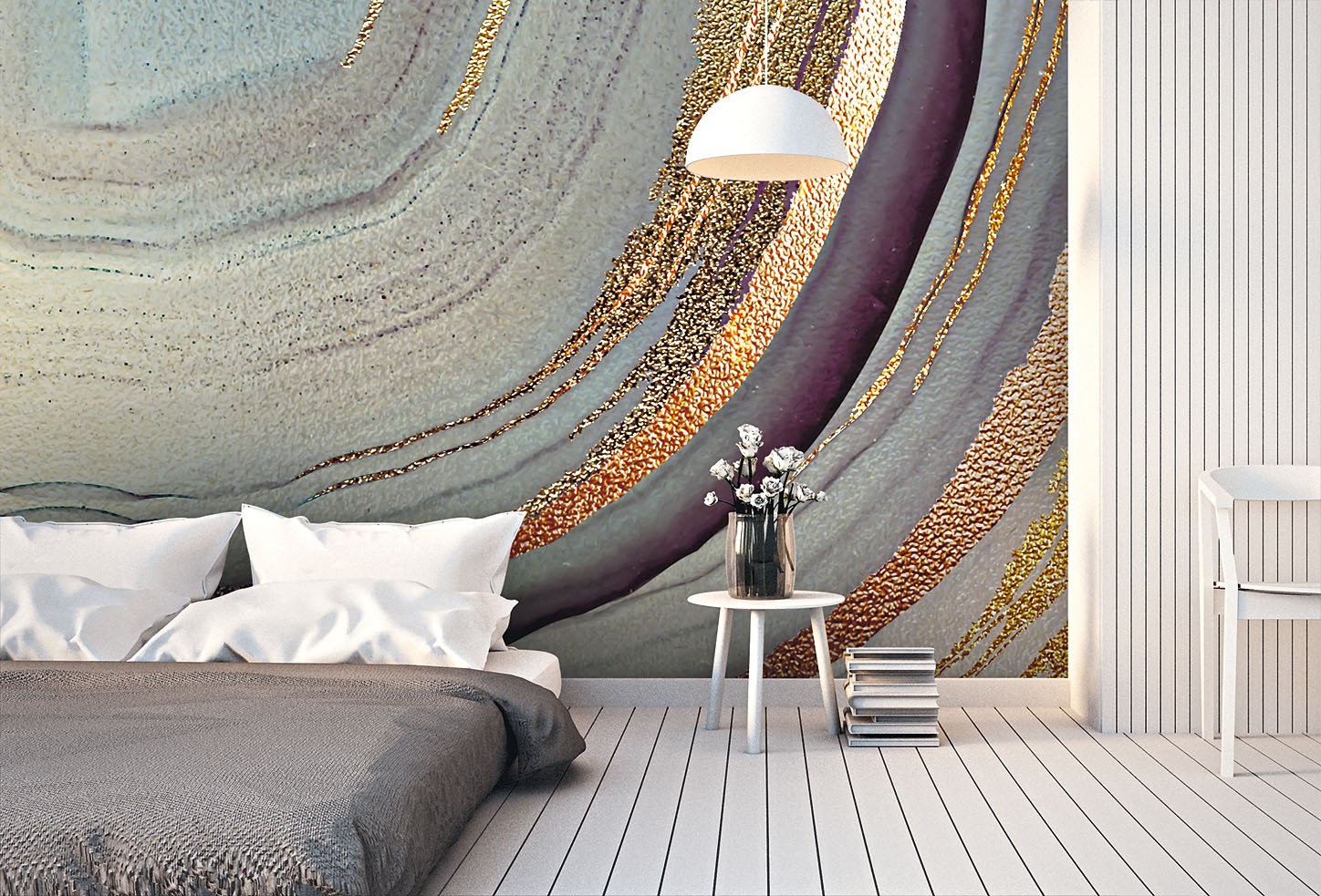 Чтобы получить красивую картинку за изголовьем, необязательно браться за кисть. Производители предлагают множество вариантов обоев, фотопанно и фресок на самоклеящейся основе, которые изготовят строго под размер стены. Некоторые из них предназначены для временного декора пространства и могут с легкостью удаляться, что особенно актуально для тех, кто снимает жилье. Кроме того, на нетканую основу можно перенести любое изображение из твоего фотоархива.