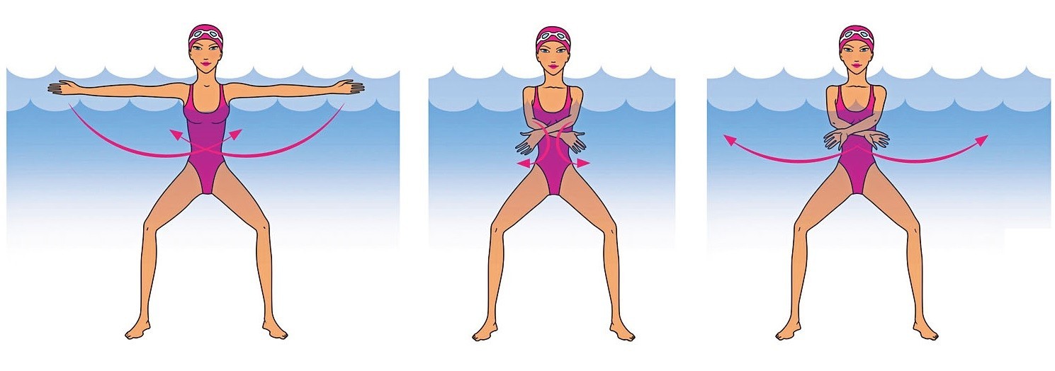 2. Преодолевая сопротивление воды, разведи руки в стороны и слегка отведи за спину. Затем сделай руками резкое движение вниз, выпрямляя локти. Повтори 30 раз.