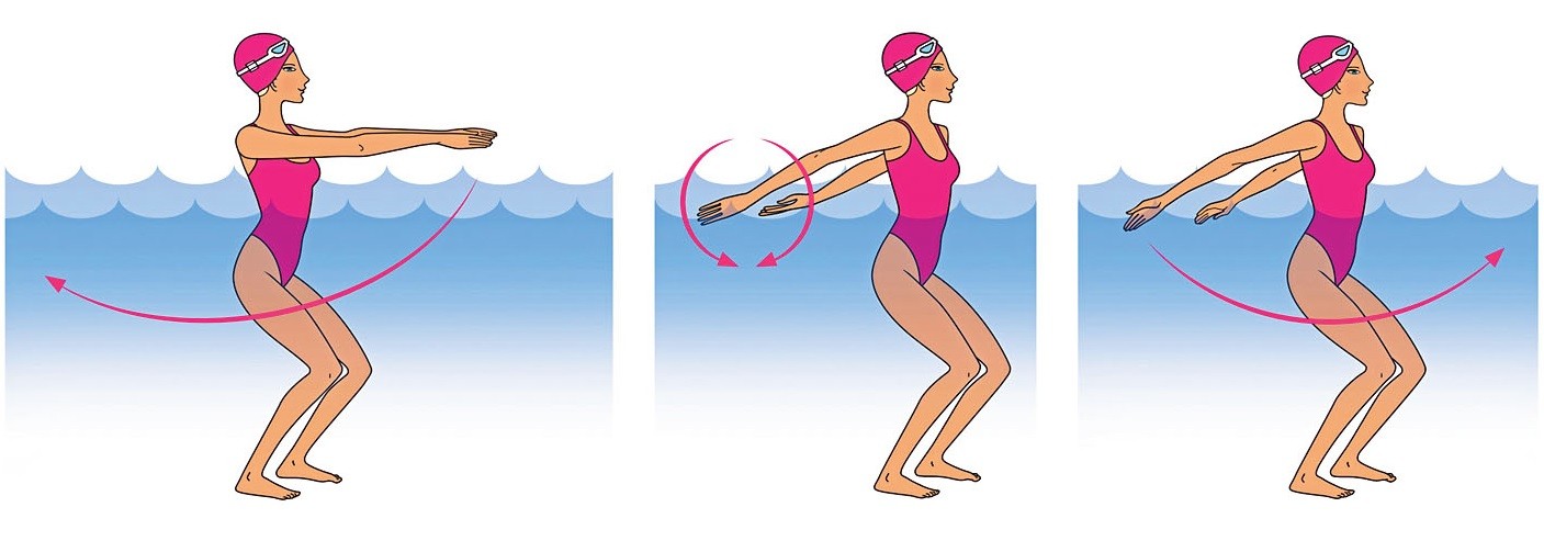 1. Упражнение эффективно укрепляет мышцы рук, груди и плечевого пояса. Зайди в воду по шею, согни ноги в коленях, живот втяни, руки вытяни перед собой.